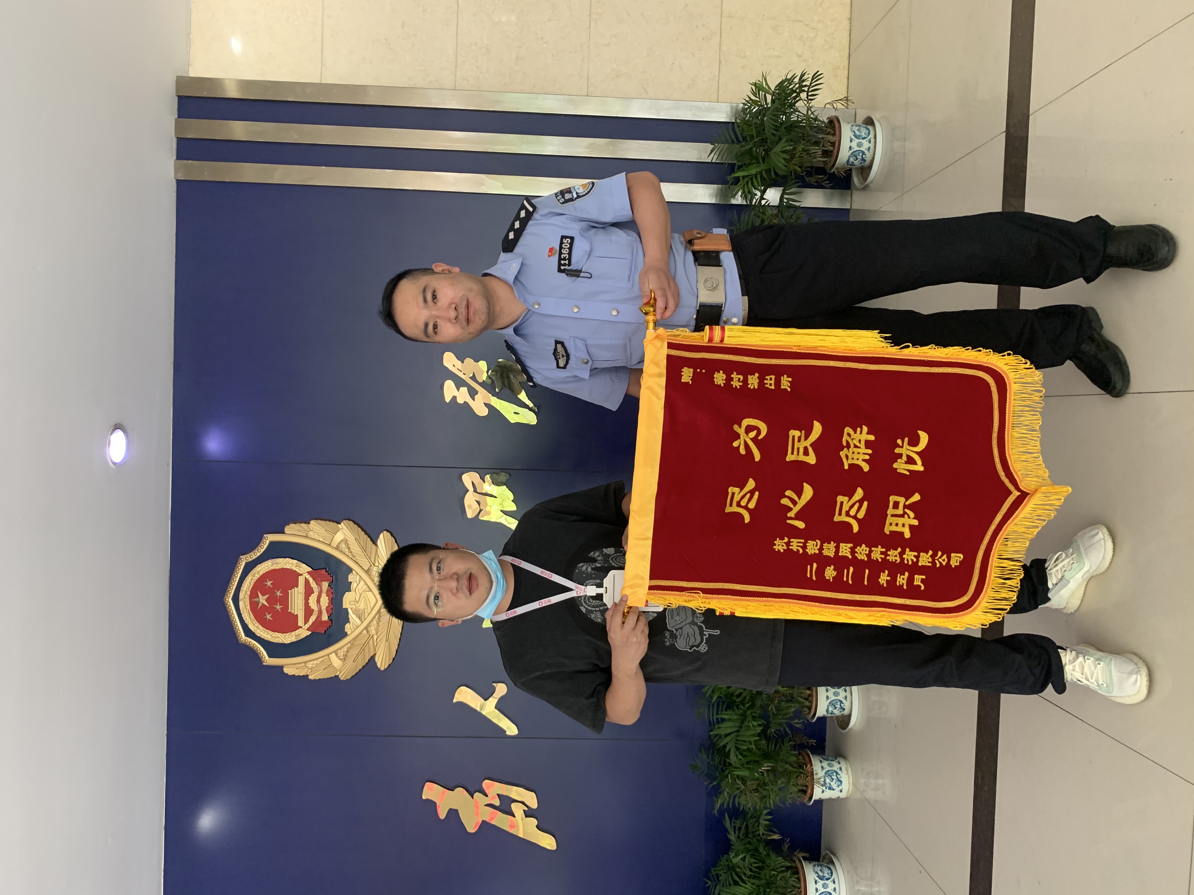 蒋村派出所、蒋村司法所为我司打造了安全可靠的办公环境,为表达谢意,我司于2021年5月31日向蒋村派出所、蒋村司法所分别赠送了一面印有“为民解忧尽心尽职”的锦旗,由我司法人代表封总赠出,并合影留念。